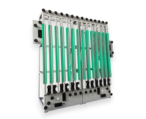 2.利用滑车顺序地向上运动,带动链条循环移动,这样就不断地将入管端设备传递过来的铝管自动地储存在中间储存架上,同时又能利用滑车顺序地向下运动,带动链条移动,使下部循环链条减少,这样就不断地将中间储存架下部循环段链条链杆上的铝管通过出管设备卸载下来,再传递给下道工序。